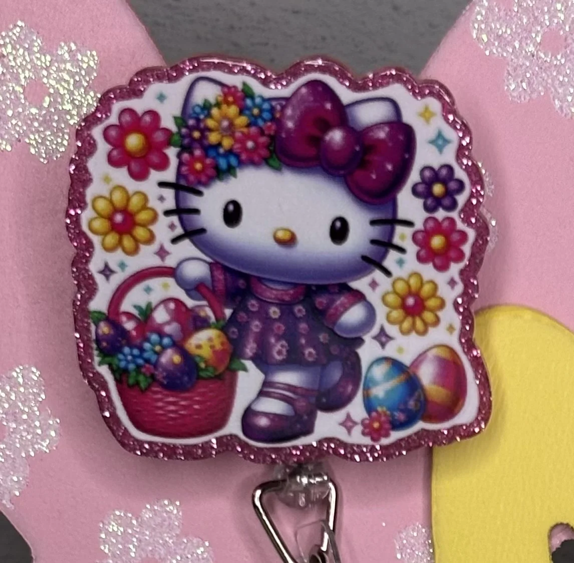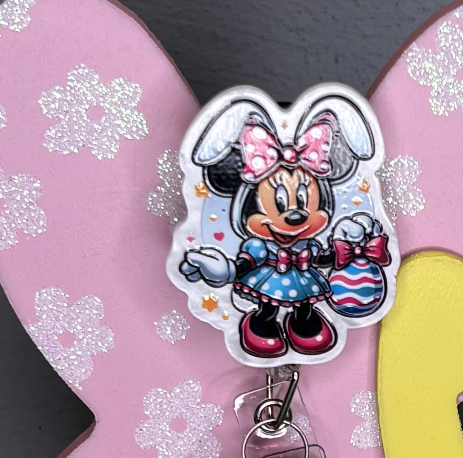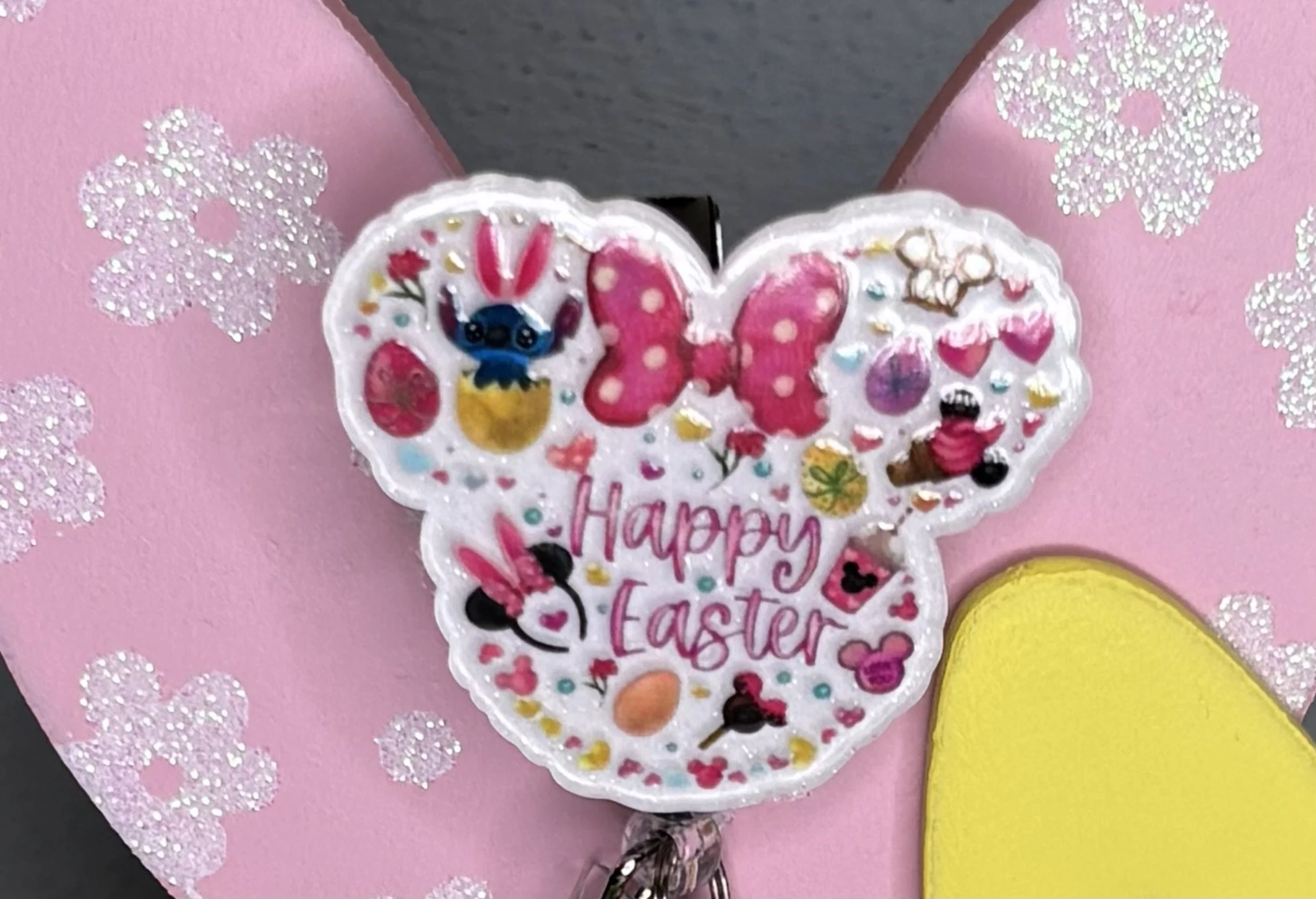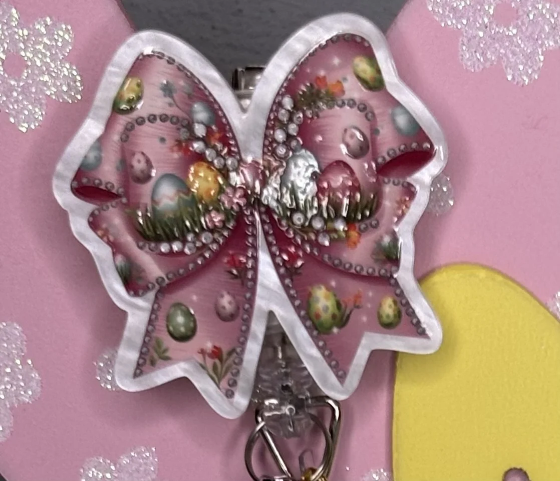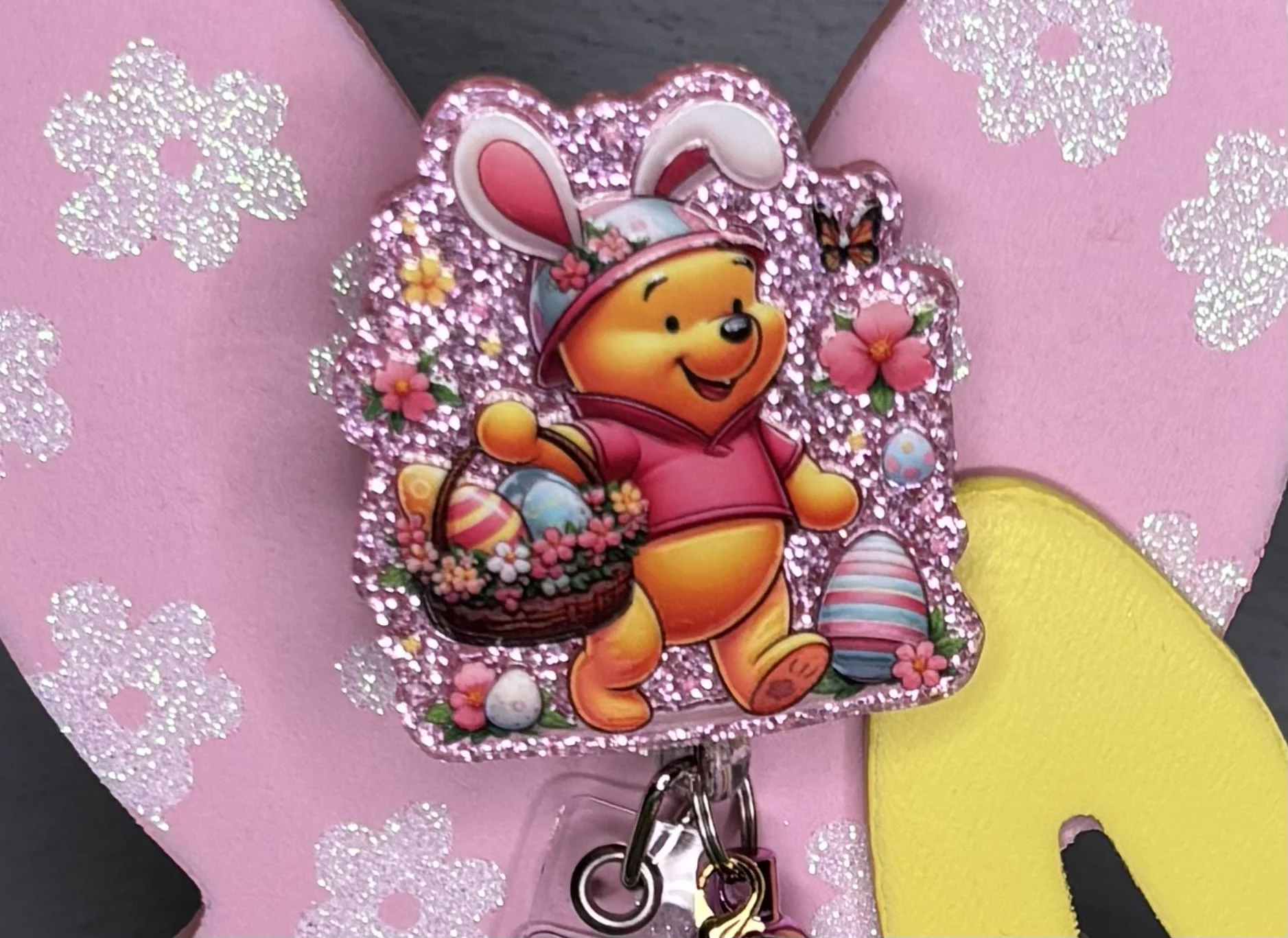 Bring some Hundred Acre Wood magic to your workday with this stunning, handmade Winnie the Pooh badge reel. Featuring Pooh Bear in his bunny-ear best, carrying a basket of colorful eggs on a high-shine pink glitter base, it's the ultimate 2026 statement piece.