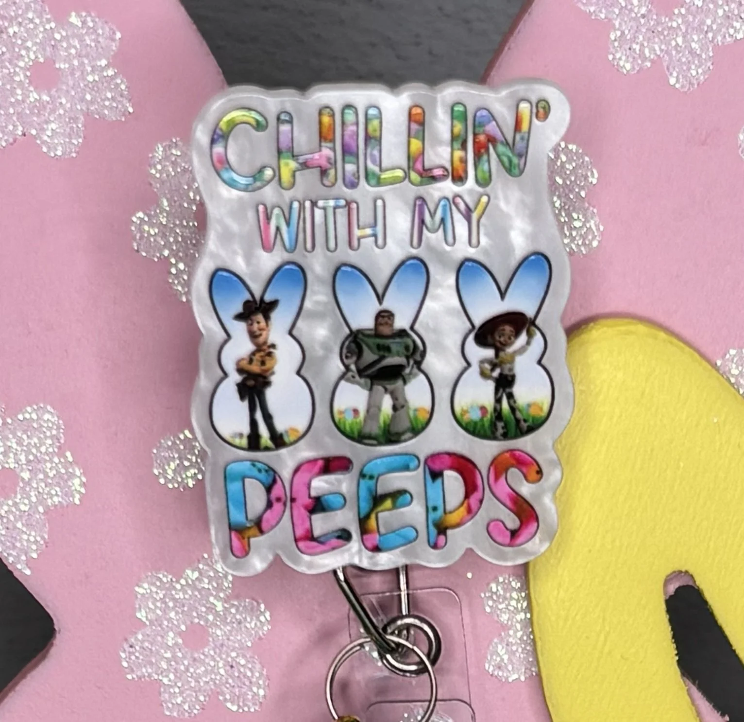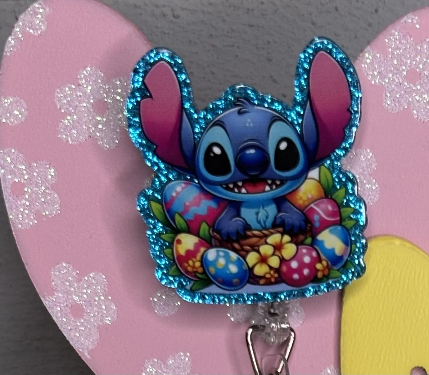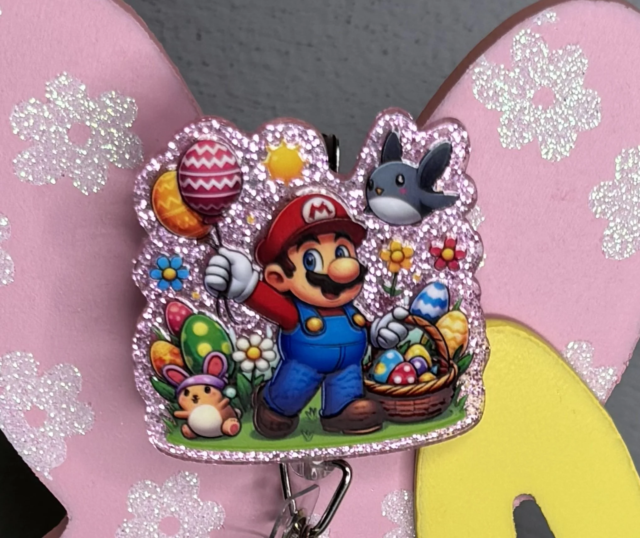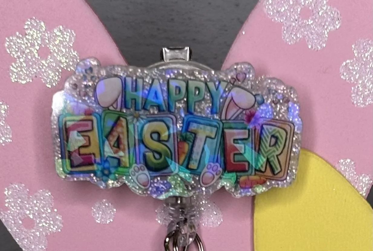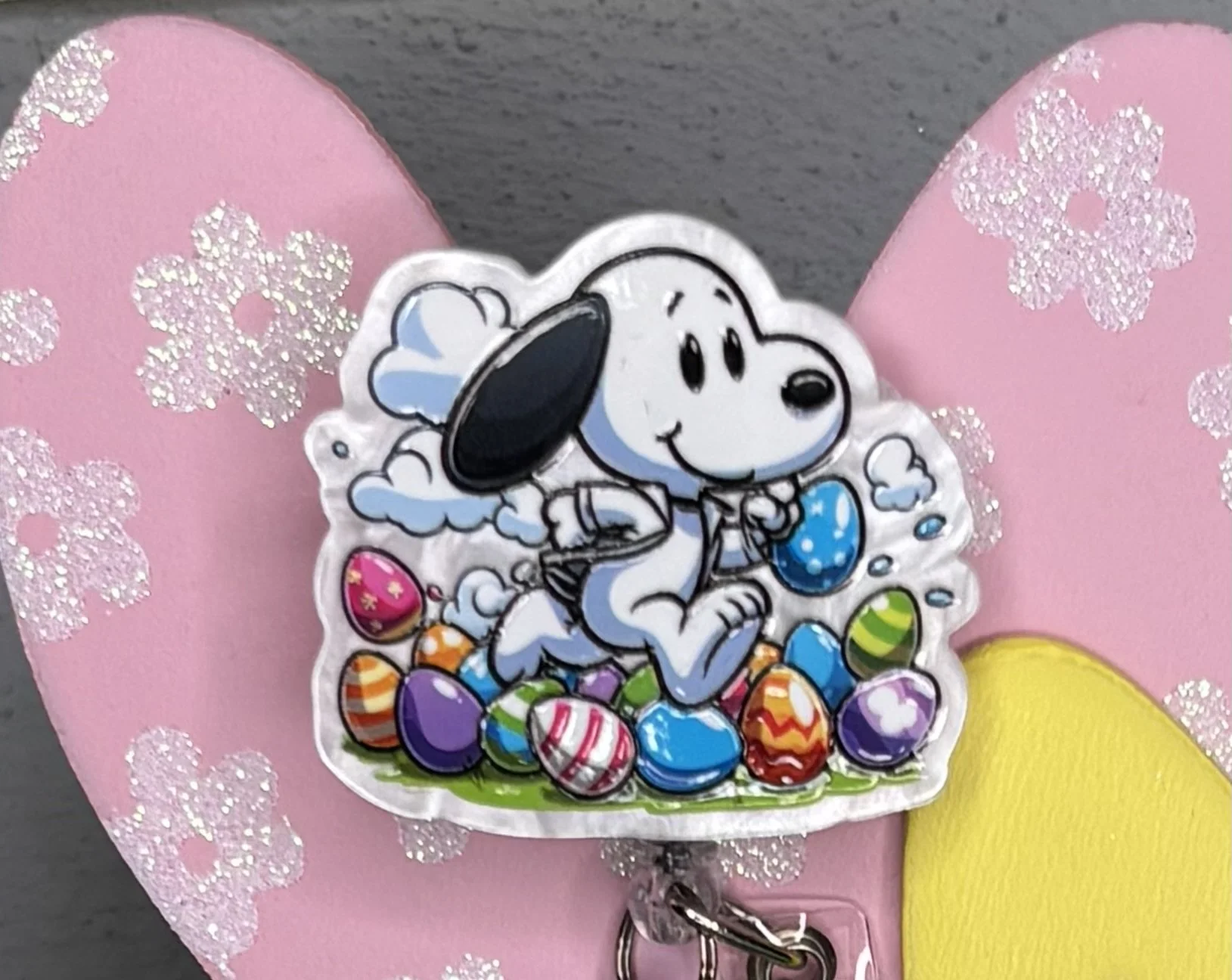 Bring some Hundred Acre Wood magic to your workday with this stunning, handmade Winnie the Pooh badge reel. Featuring Pooh Bear in his bunny-ear best, carrying a basket of colorful eggs on a high-shine pink glitter base, it's the ultimate 2026 statement piece.