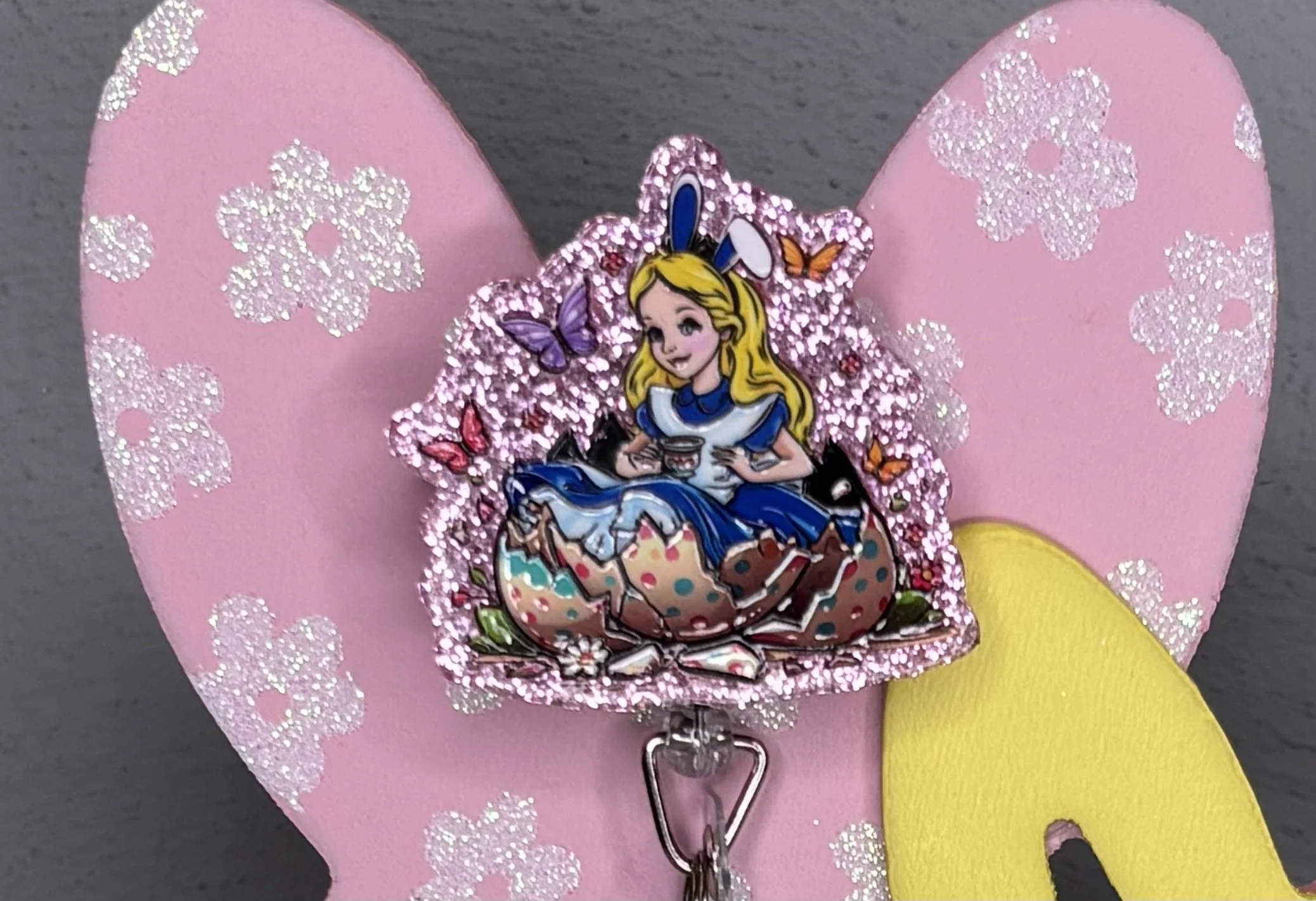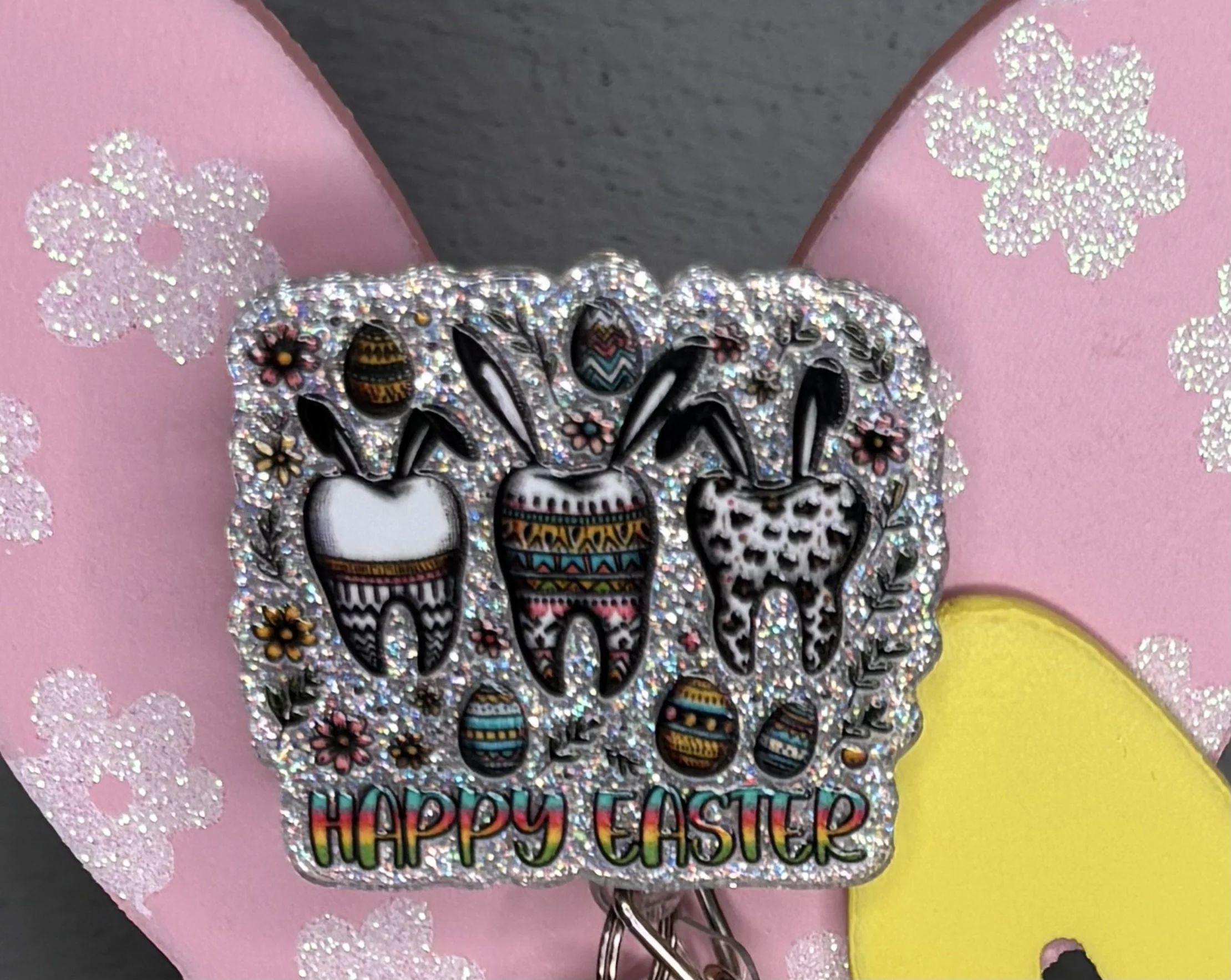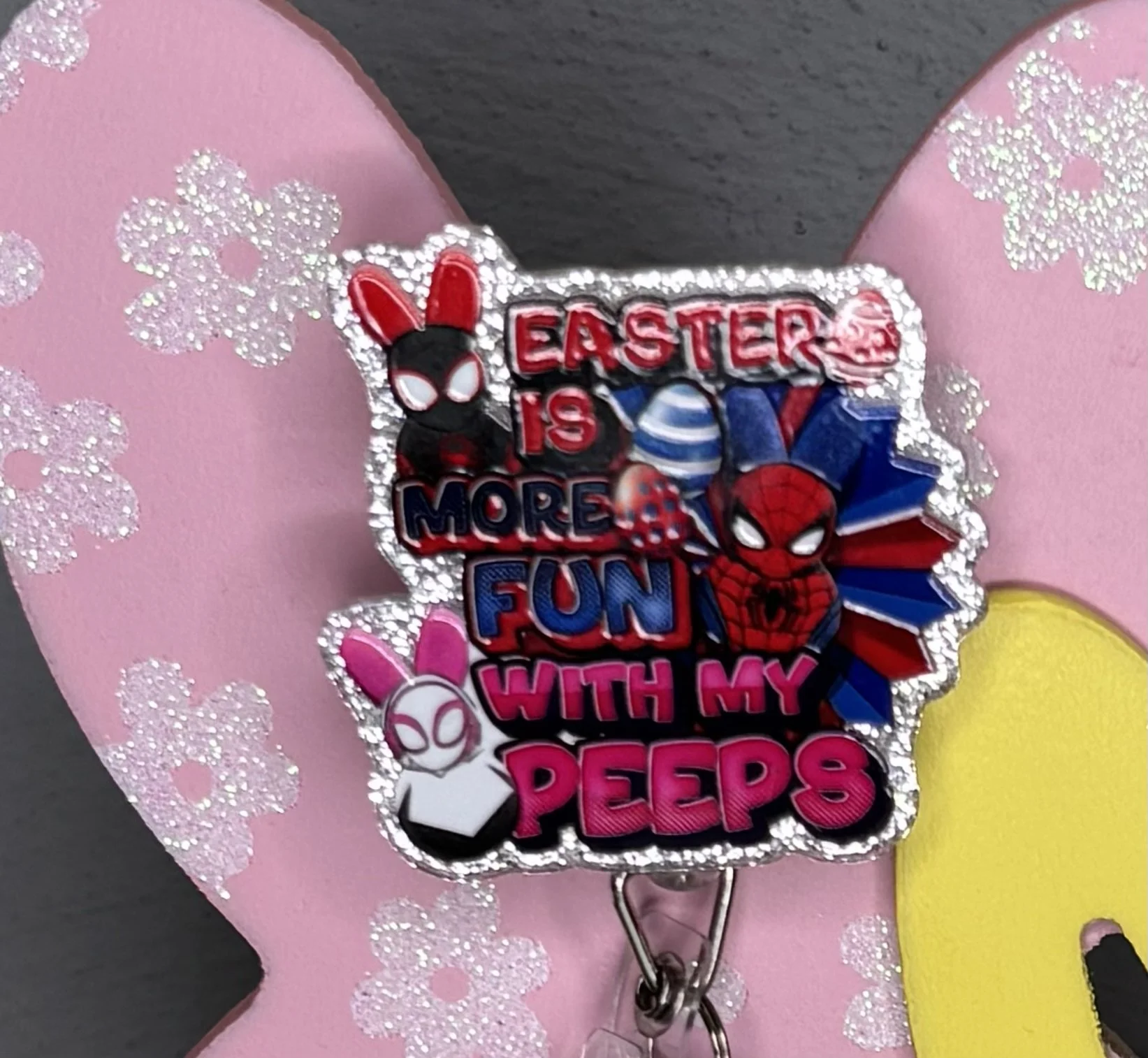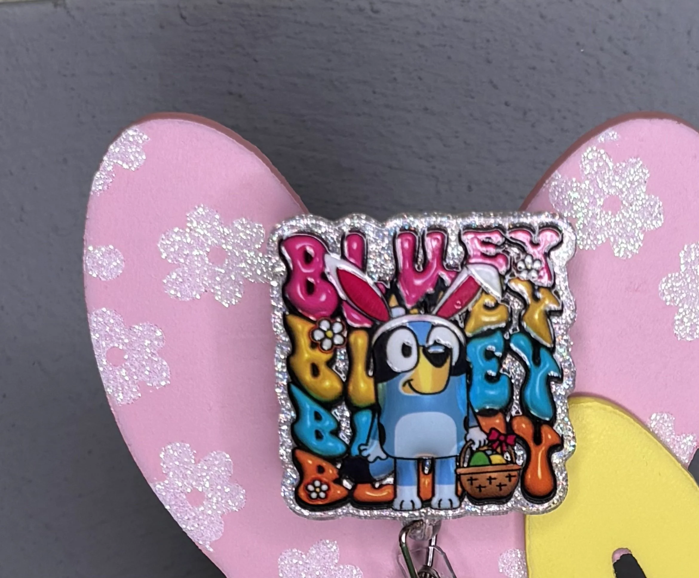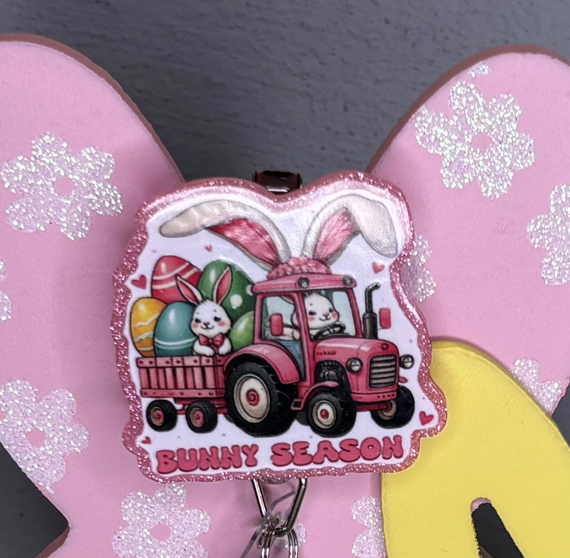 Bring some Hundred Acre Wood magic to your workday with this stunning, handmade Winnie the Pooh badge reel. Featuring Pooh Bear in his bunny-ear best, carrying a basket of colorful eggs on a high-shine pink glitter base, it's the ultimate 2026 statement piece.