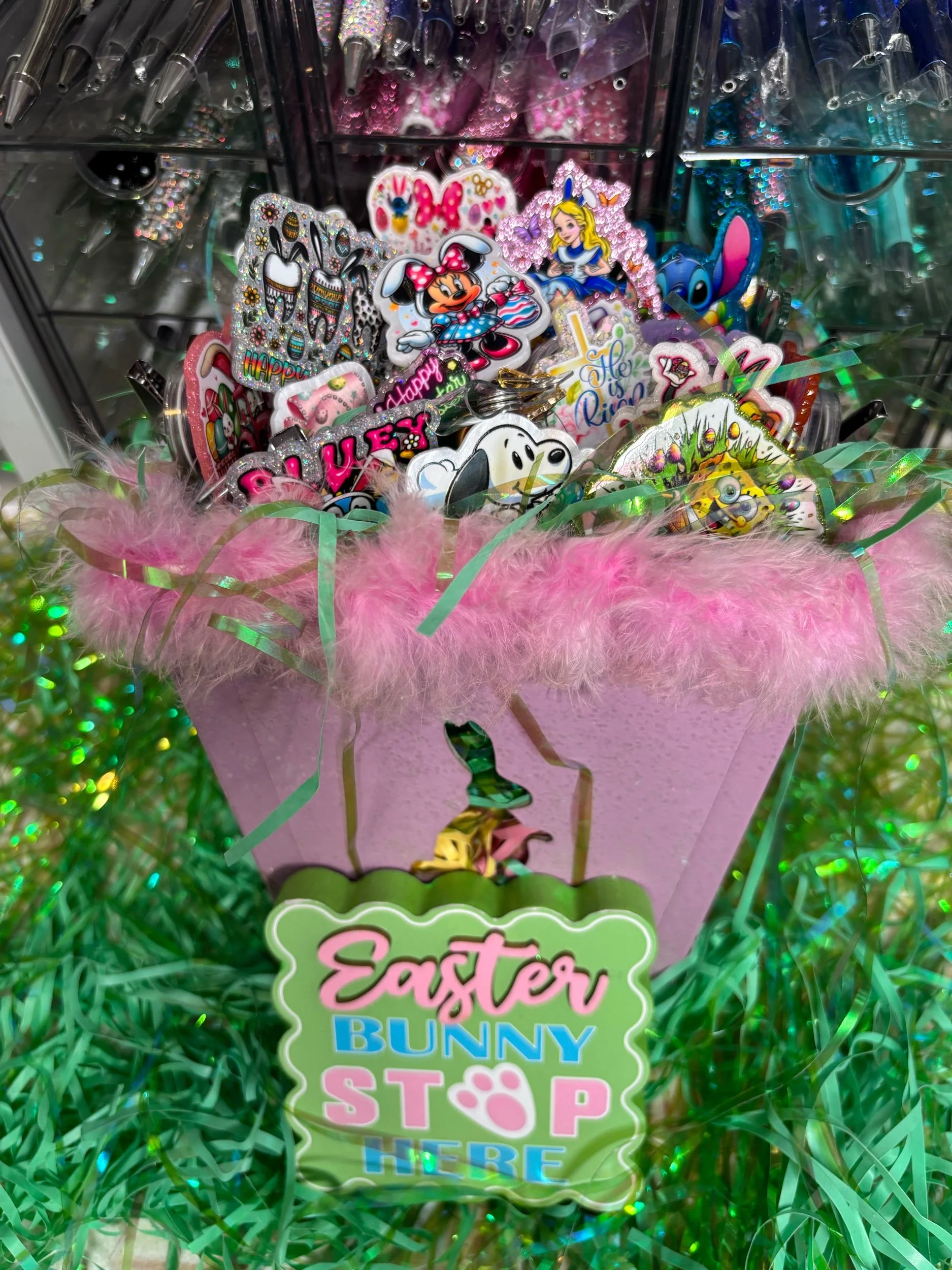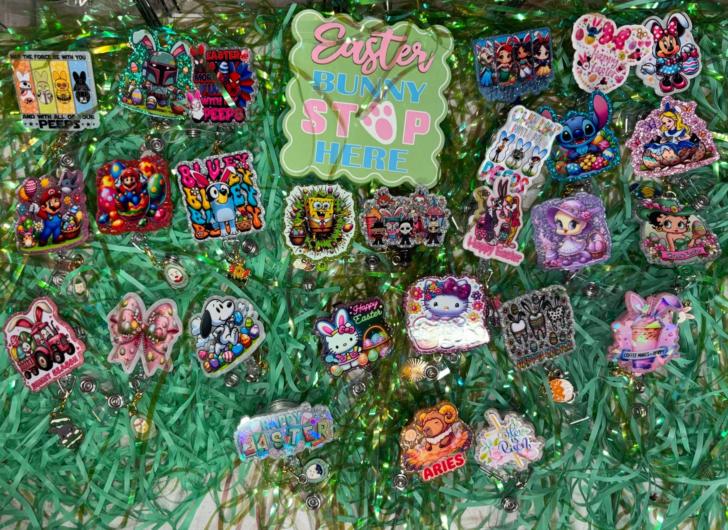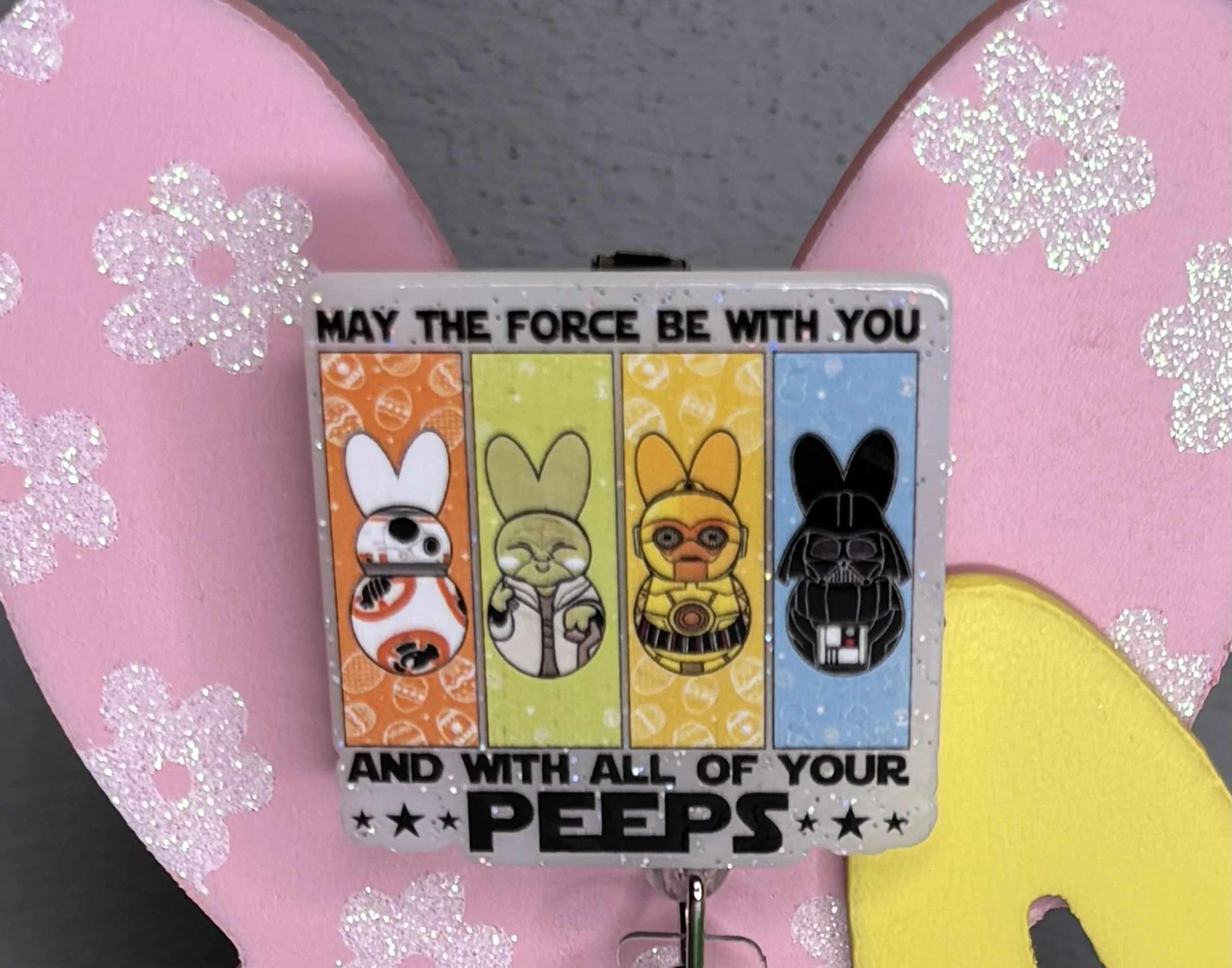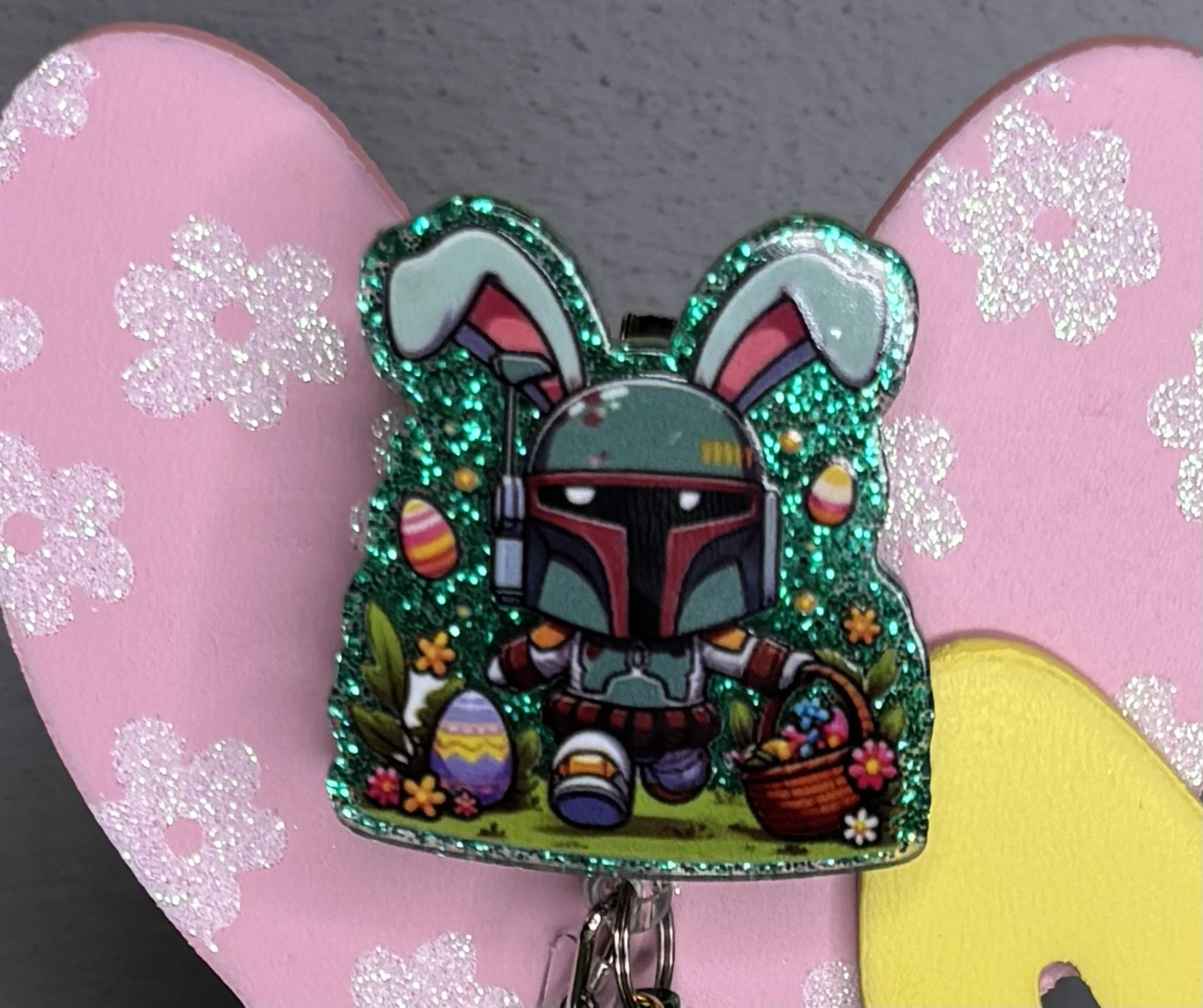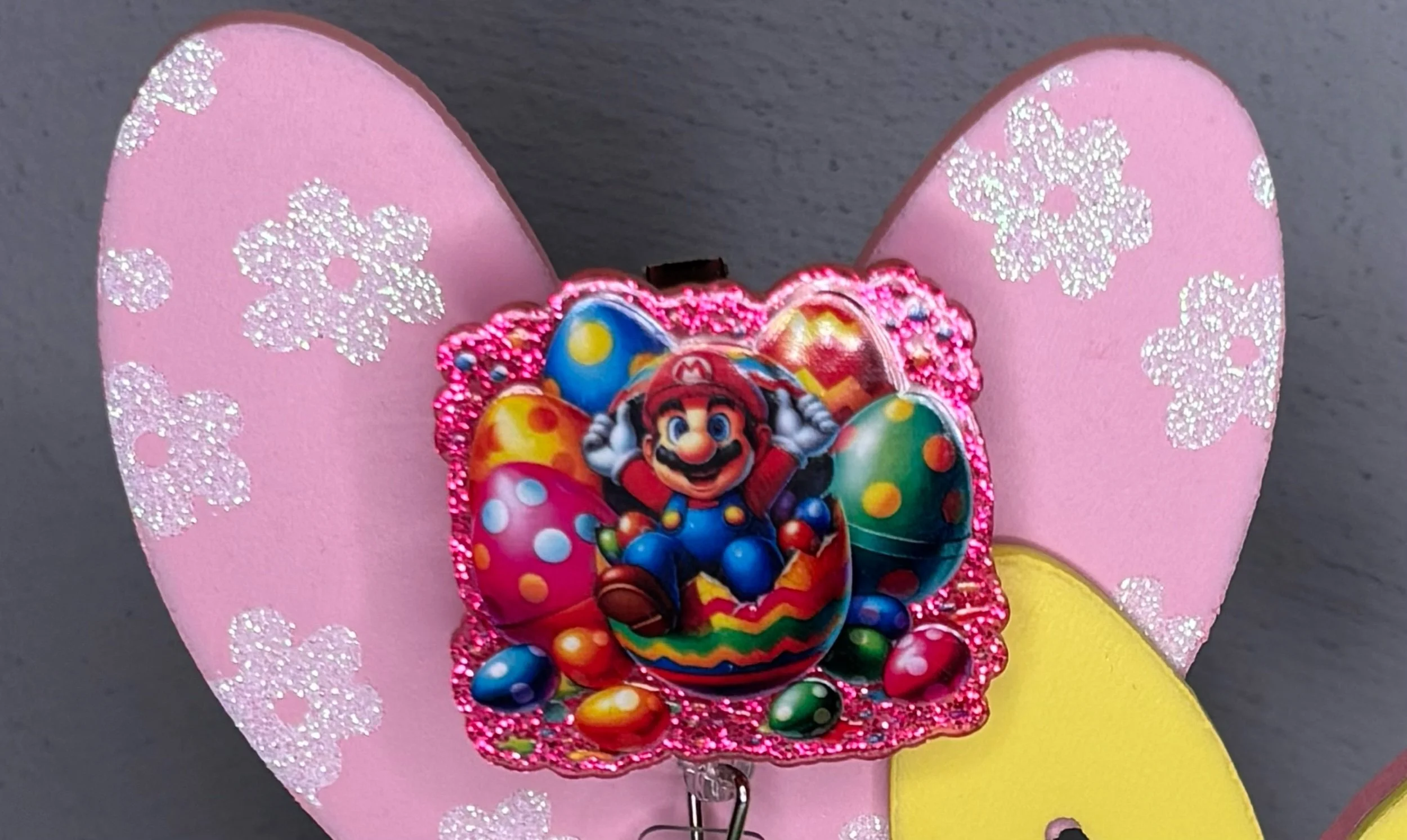 Bring some Hundred Acre Wood magic to your workday with this stunning, handmade Winnie the Pooh badge reel. Featuring Pooh Bear in his bunny-ear best, carrying a basket of colorful eggs on a high-shine pink glitter base, it's the ultimate 2026 statement piece.